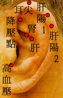 於 耳 部 肝 、 腎 、 皮 質 下 、 肝 陽 、 交 感 、 降 壓 點